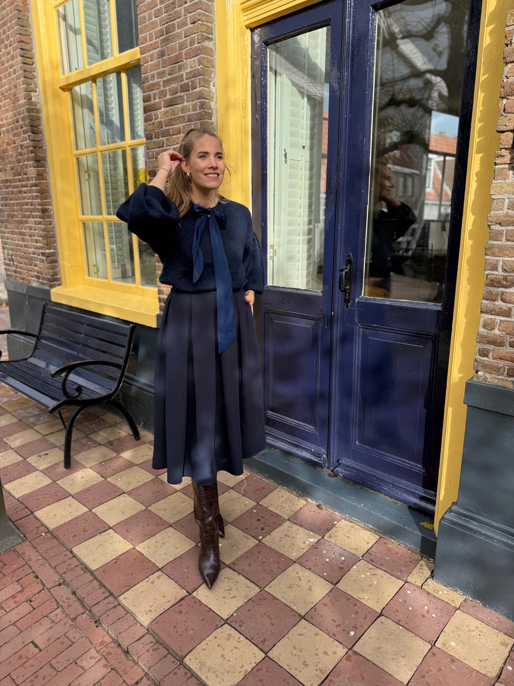 Deze donkerblauwe A-lijn midi rok is klassiek, stijlvol en super veelzijdig. De soepelvallende stof en elegante lengte zorgen voor een mooie vrouwelijke look. Perfect voor een dag op kantoor, een diner of gewoon een stijlvolle dag in de stad. Model draagt S/M