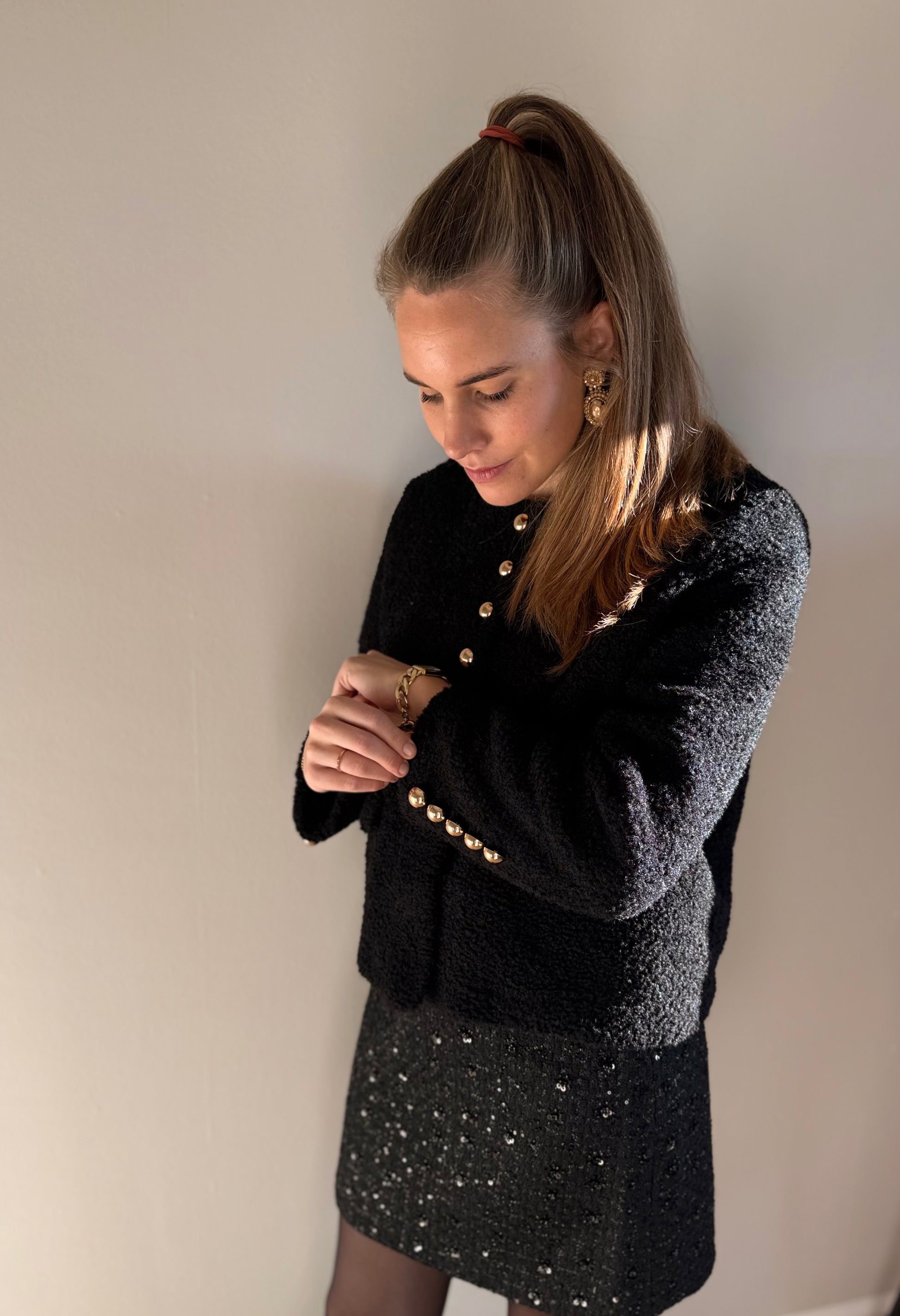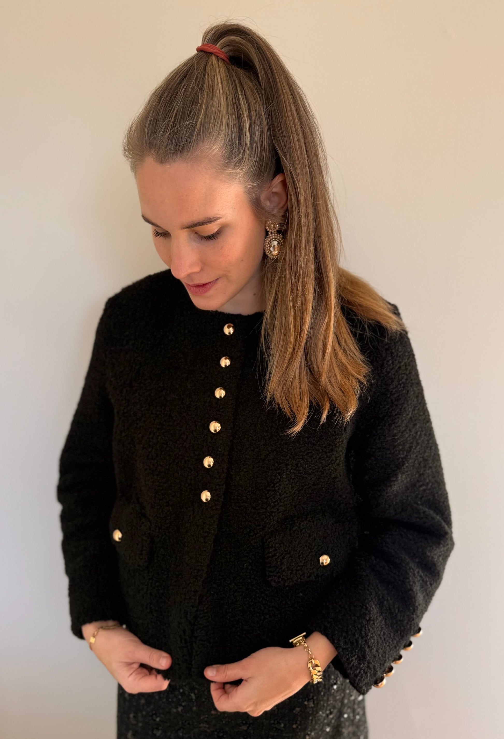 Dit elegante zwarte bouclé jasje met goudkleurige knopen straalt pure luxe uit. De rechte pasvorm, zachte structuur en chique details maken het een perfecte keuze voor zowel classy als feestelijke outfits.