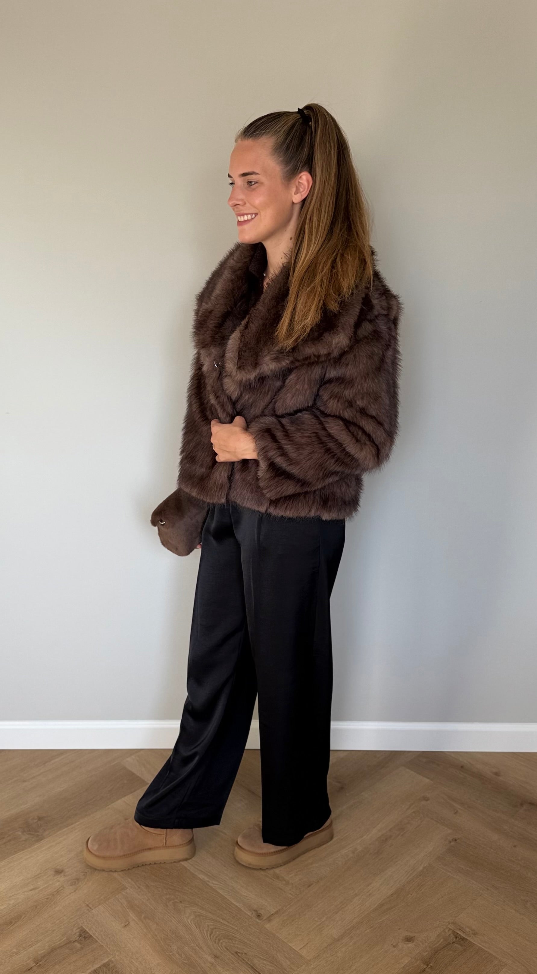 Voeg een vleugje luxe toe aan je look met deze stijlvolle korte bontjas in een warme, rijke bruine tint. Gemaakt van hoogwaardig imitatiebont voelt deze jas zijdezacht aan en biedt hij zowel comfort als klasse. Aan de binnenzijde van de jas zitten drukknopen bevestigd om de jas dicht te dragen.
