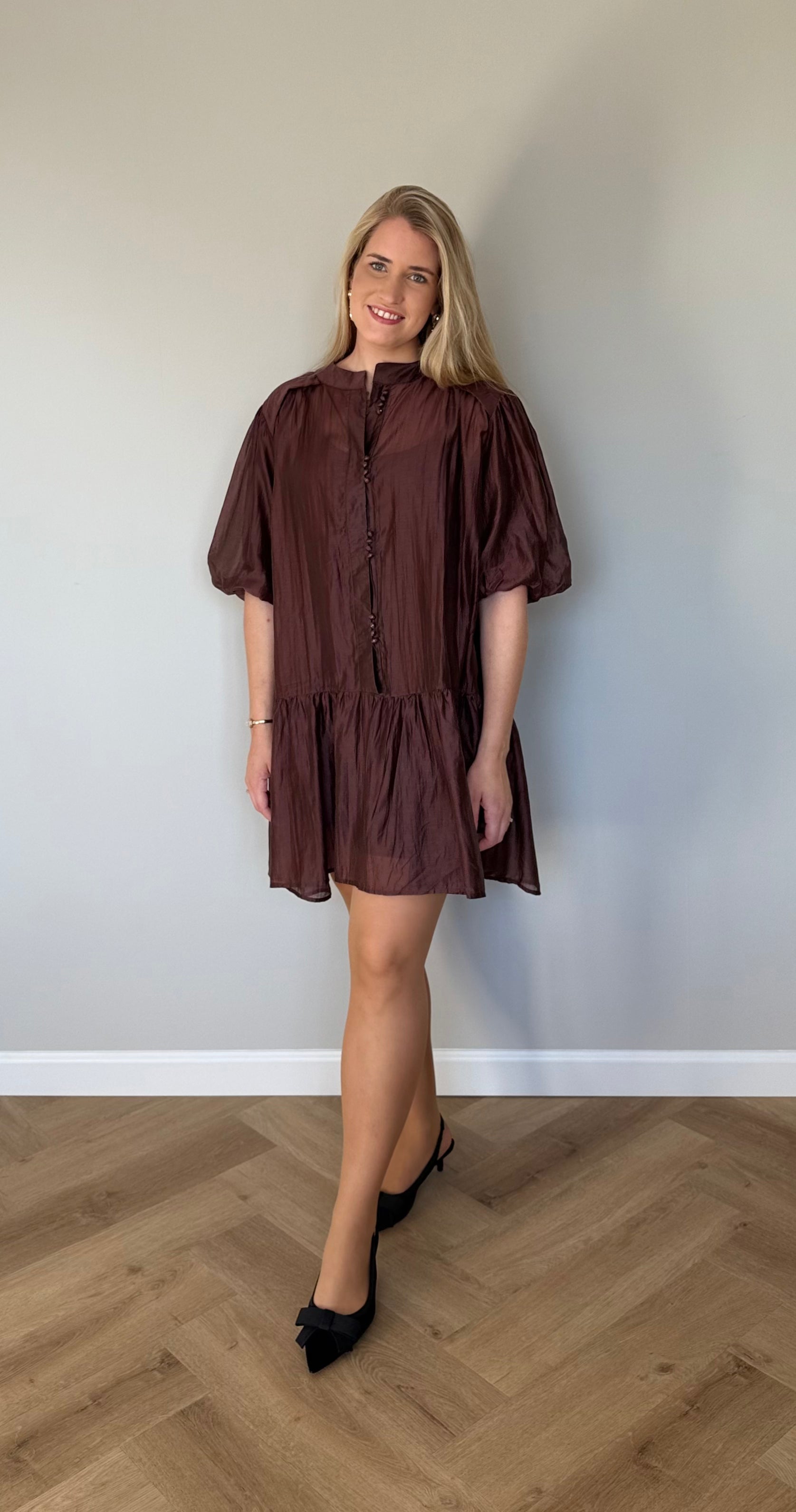 Dit jurkje is een must-have voor in je garderobe. Het licht doorschijnende bovenmateriaal valt luchtig en word gecombineerd met een los onderjurkje voor een comfortabele en bedekte fit met een strikceintuur om de taille te accentueren. De knoopjes en pofmouw geven een chique effect. Het jurkje kun je dragen met ceintuur, maar is ook leuk zonder ceintuur te dragen.