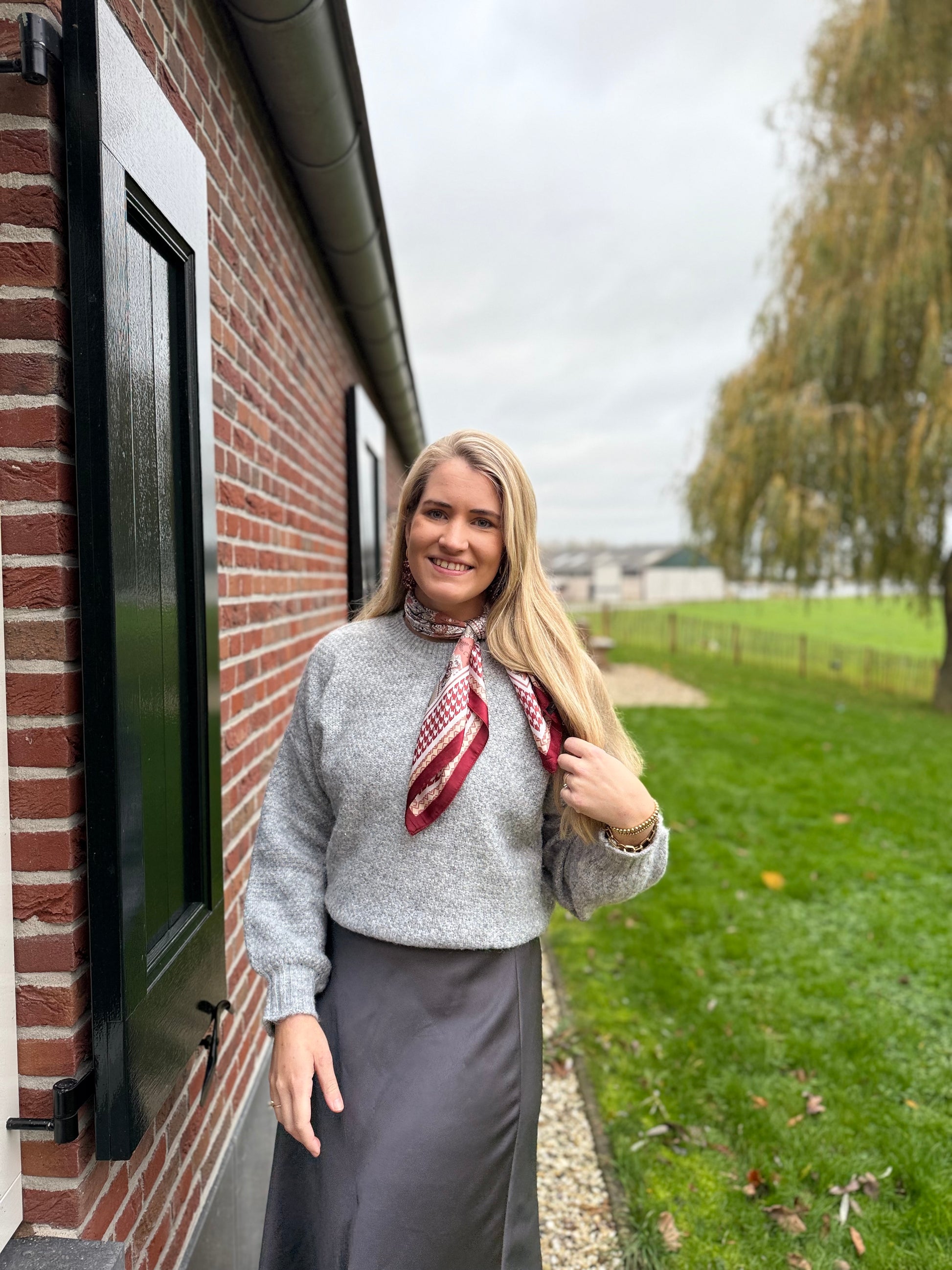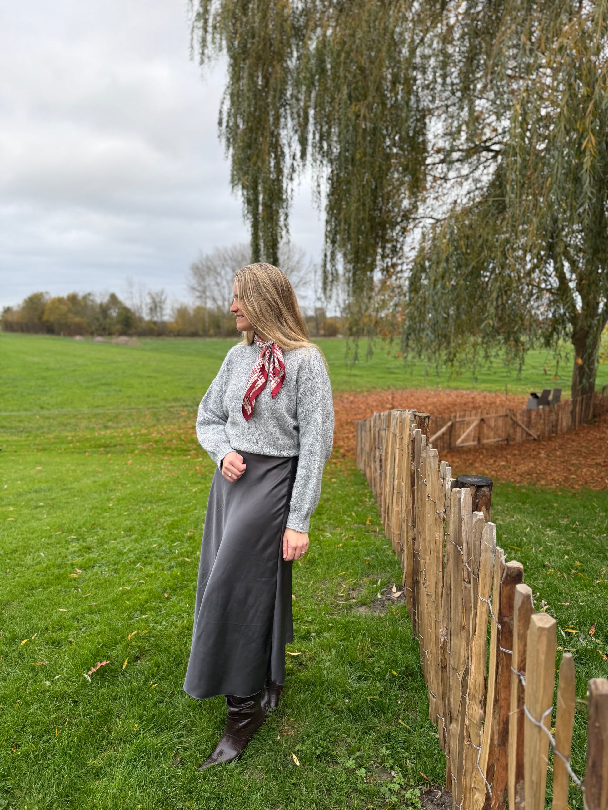 Deze grijze trui is een echte must-have voor het najaar! De zachte gebreide stof voelt comfortabel aan en heeft een subtiele glitterdraad die zorgt voor een speels, maar stijlvol effect. Perfect voor zowel een casual dag als een avondje uit.