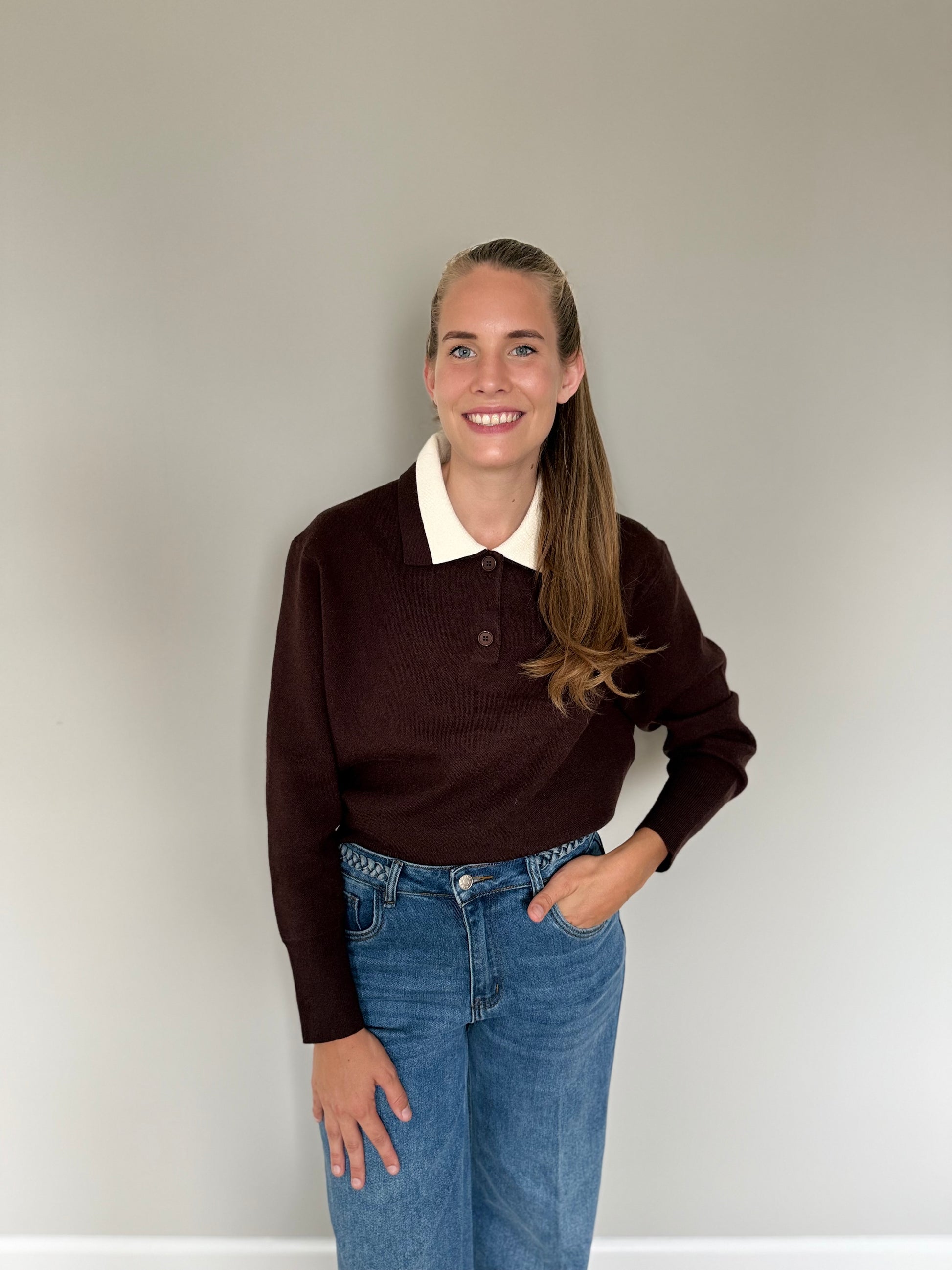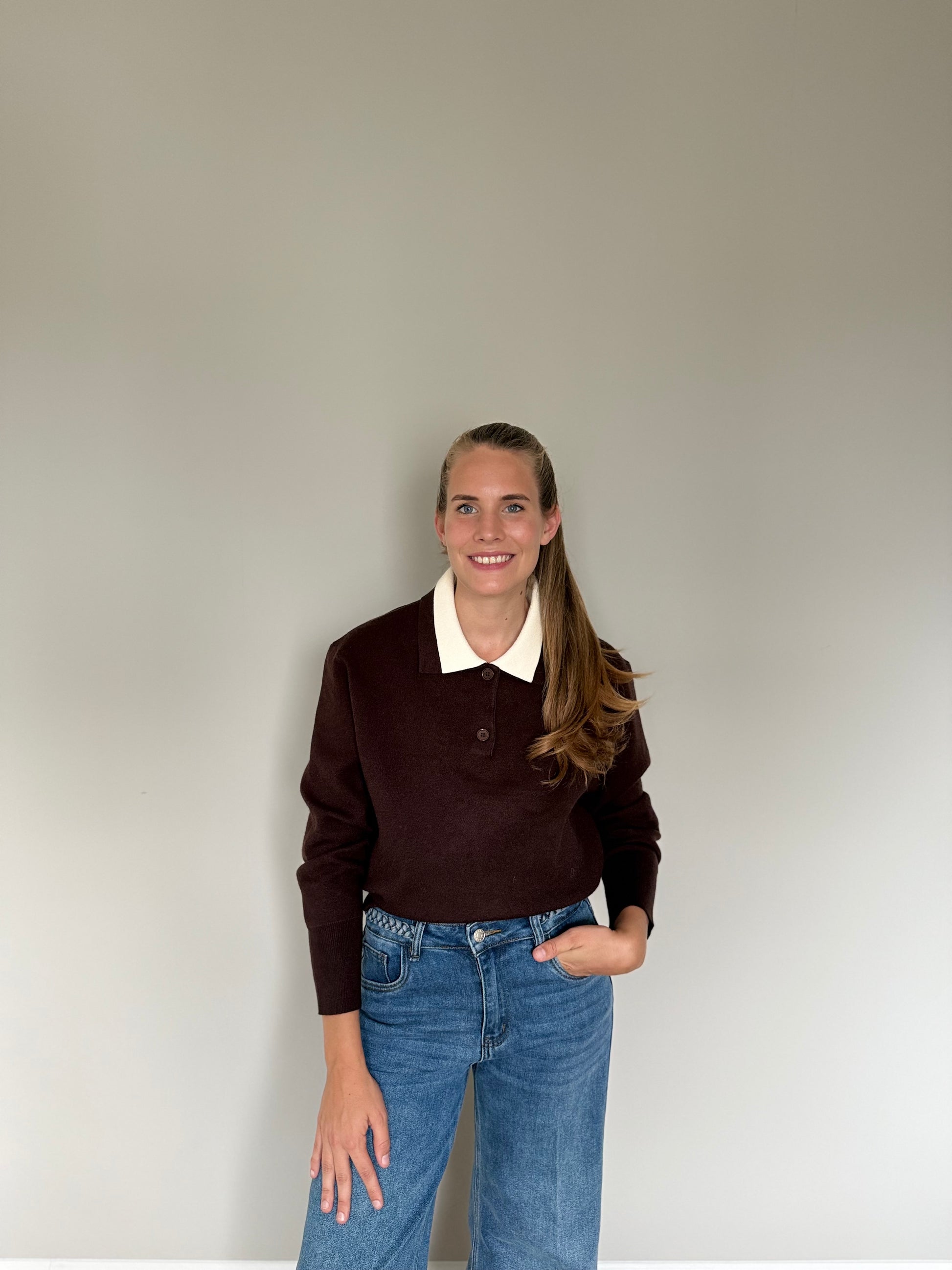 Deze prachtige trui is uitgevoerd in een mooie, bruine kleur en afgewerkt met een zachte, crème kraag die zorg voor een elegant contrast.
