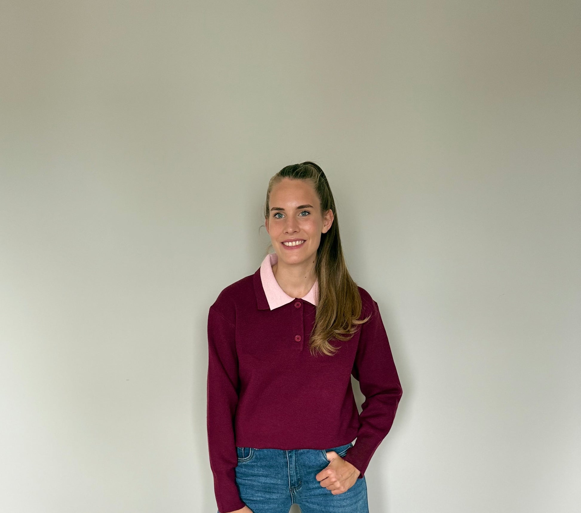 Deze prachtige trui is uitgevoerd in een warme bordeauxrode kleur en afgewerkt met een zachte, lichtroze kraag die zorg voor een elegant contrast.
