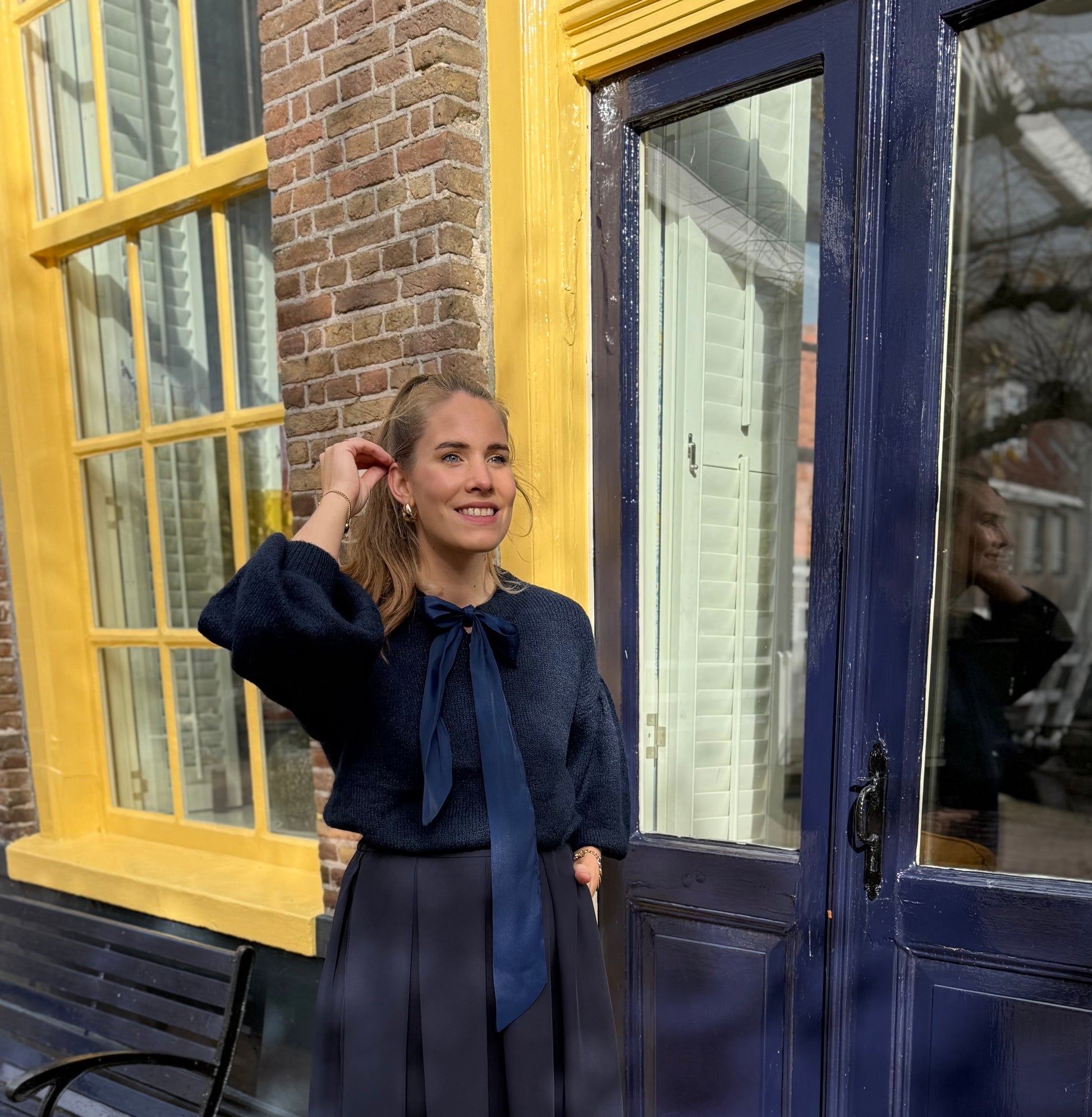 Dit blauw kleurige vestje heeft een mooie strik bij de hals die een elegante touch geeft. De pofmouwen maken de look helemaal af. Perfect voor een cozy dag, maar ook makkelijk chic te stylen voor een diner of feestje.