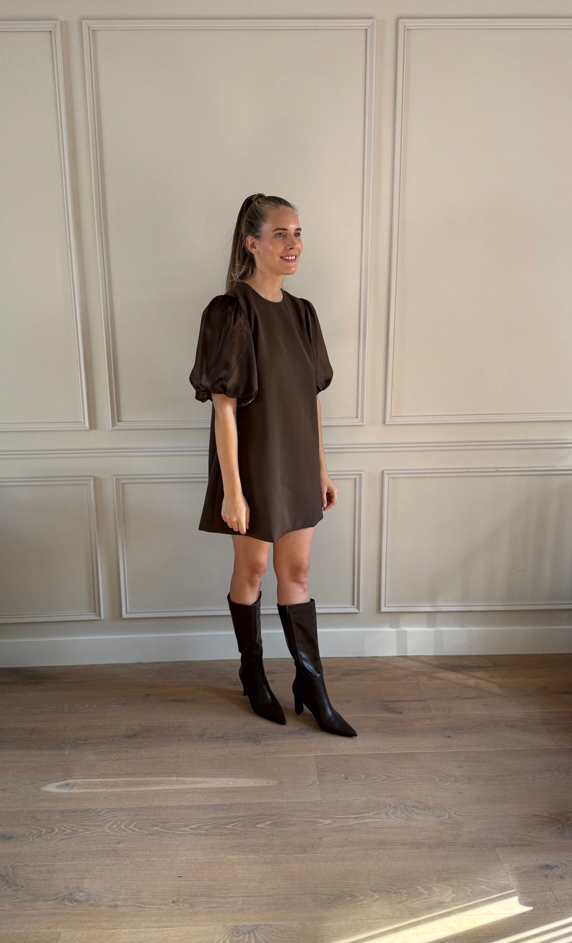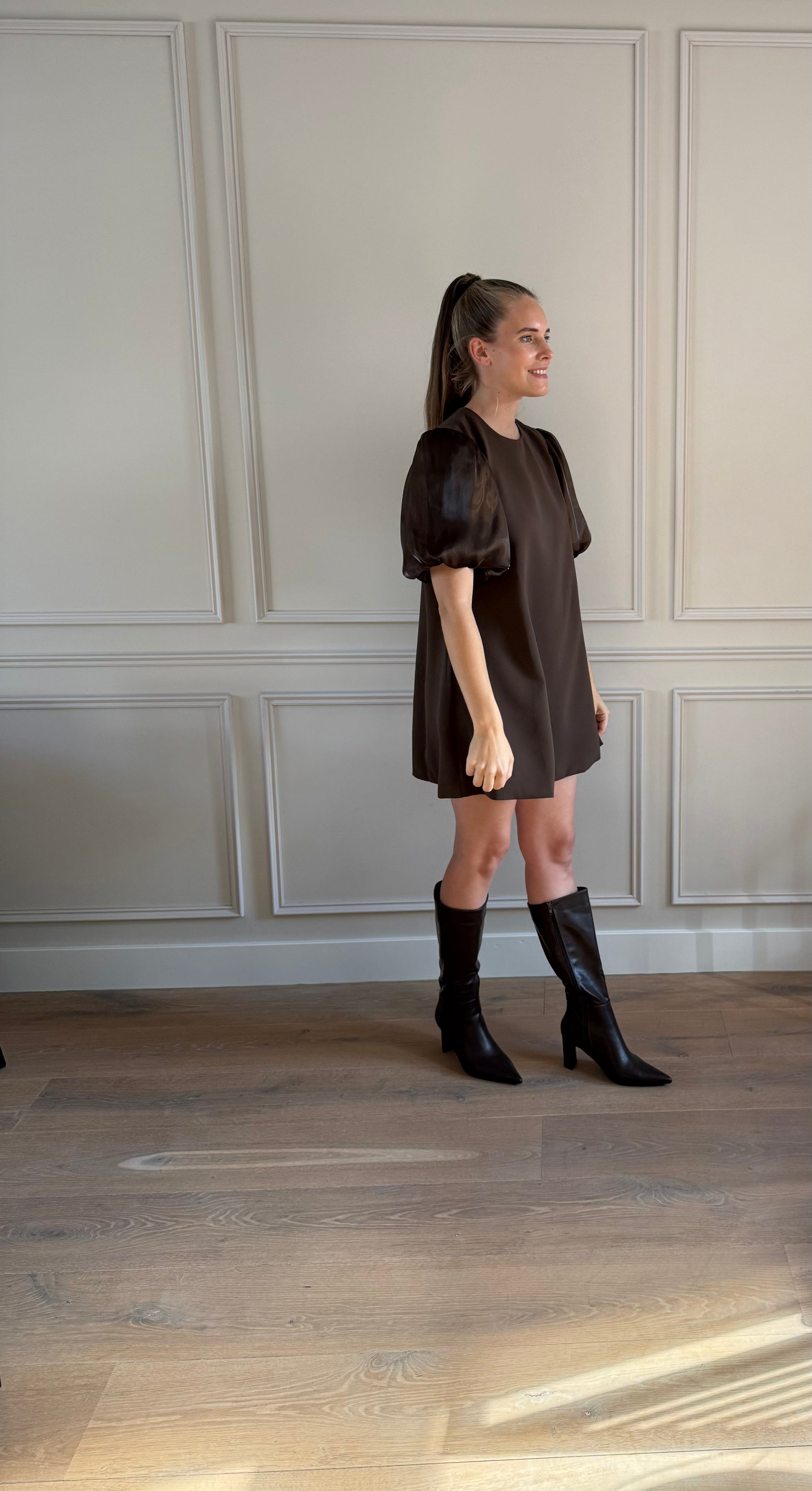 Deze bruine A-lijn jurk combineert minimalistische elegantie met een opvallend detail: glanzende satijnen pofmouwen. De jurk heeft een flatterende, losvallende pasvorm die elegant meebeweegt, terwijl de contrasterende mouwen zorgen voor een luxe en vrouwelijke touch.