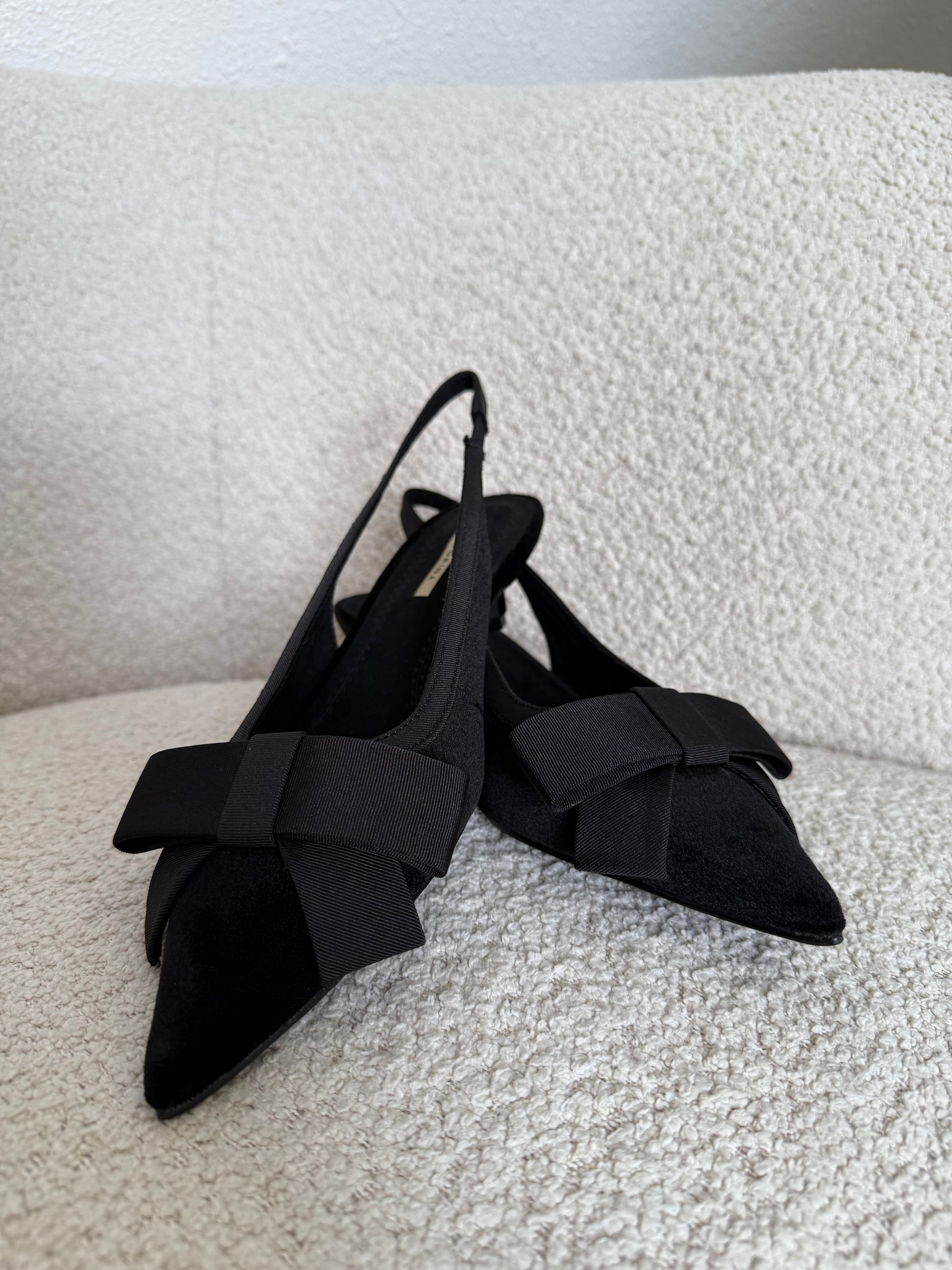 Deze slingback pumps zijn uitgevoerd in een tijdloos zwarte kleur en voorzien van een opvallende strikdetail aan de voorkant. De perfecte schoenen voor zowel een chique diner als een feestelijke gelegenheid.