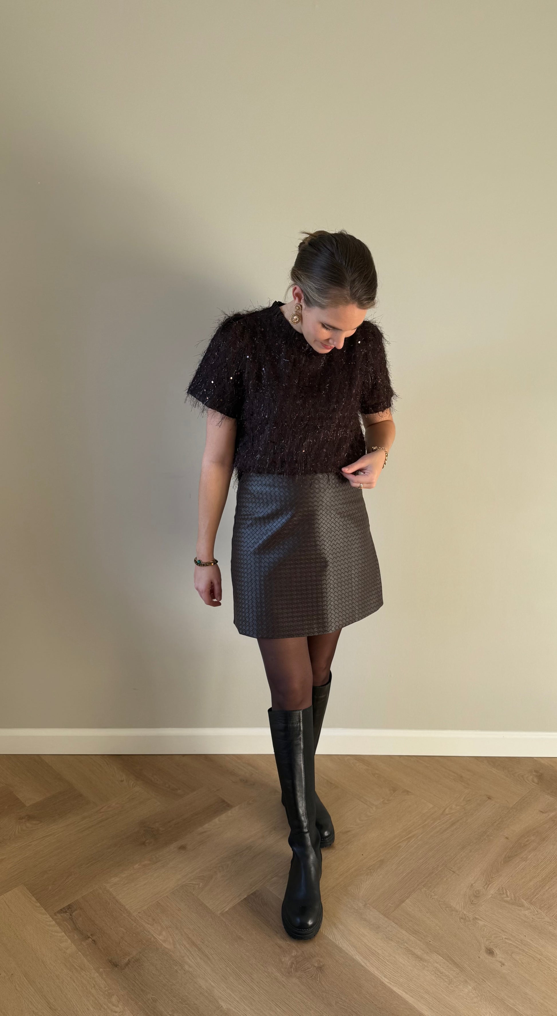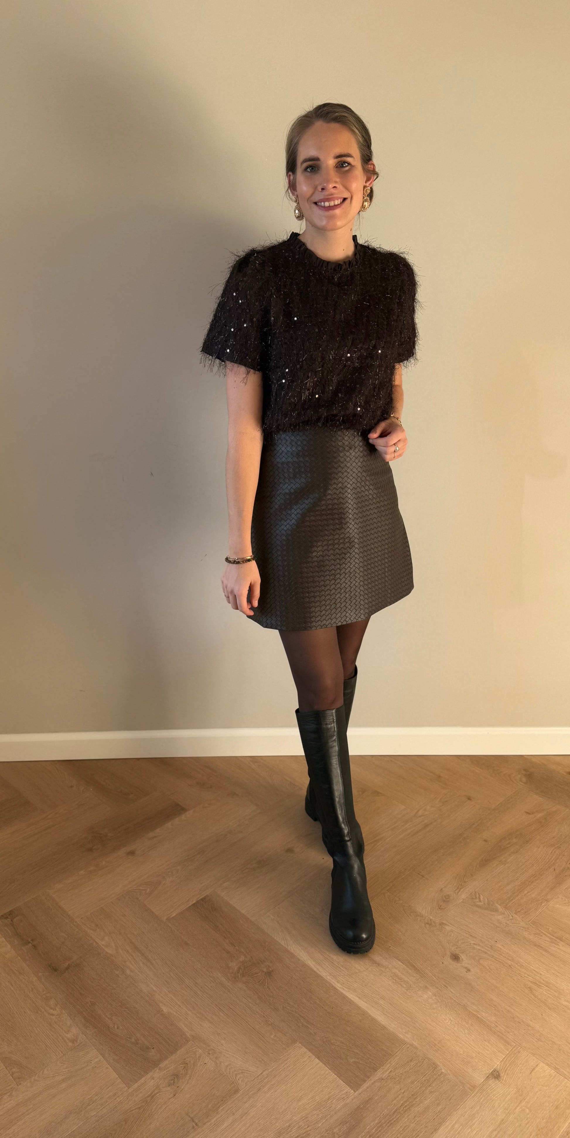 Deze stijlvolle mini-rok heeft een luxe structuurprint en een flatterende A-lijn pasvorm. Perfect te combineren met zowel een glittertop als een knit voor een elegante, moderne look.