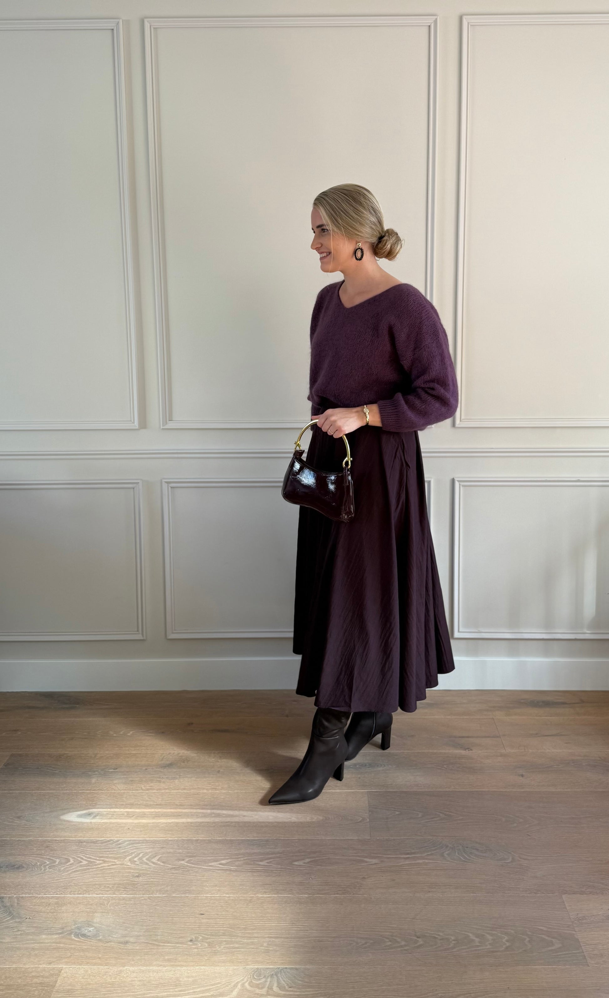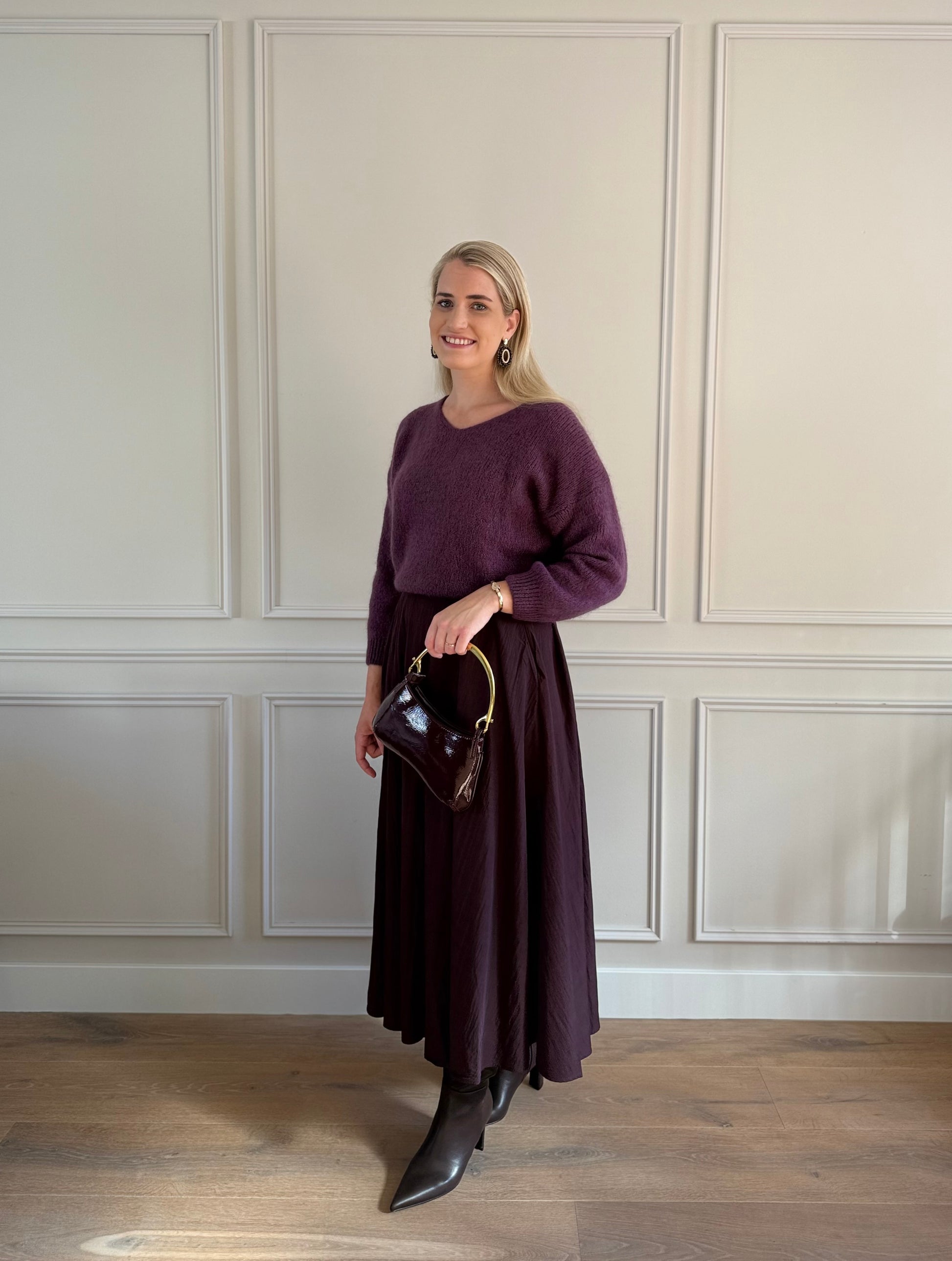 Deze warme wollen trui in een diepe aubergine kleur is een stijlvolle toevoeging aan je herfst- en wintergarderobe. De rijke paarse tint geeft je outfit direct een luxe en chique uitstraling.