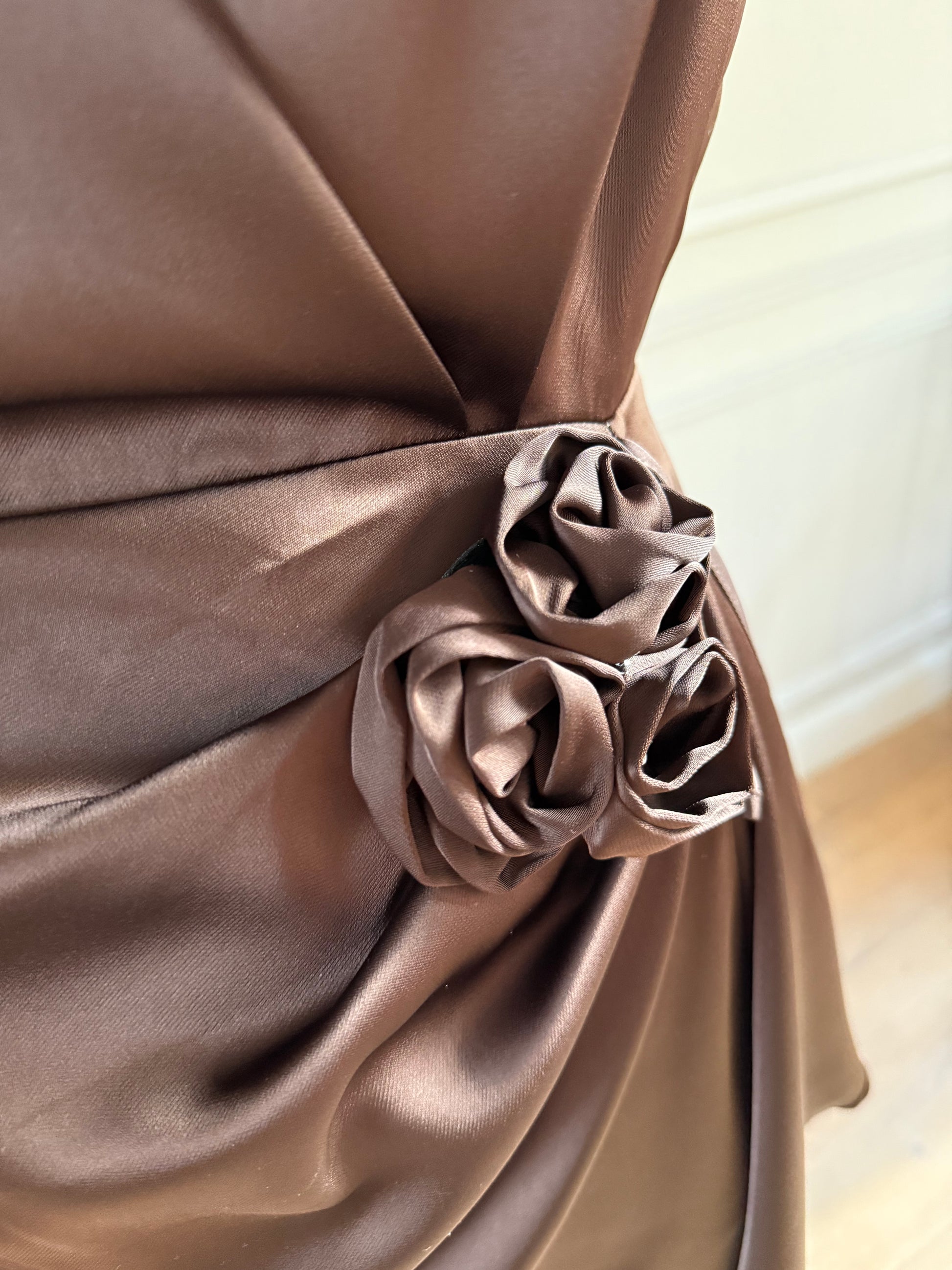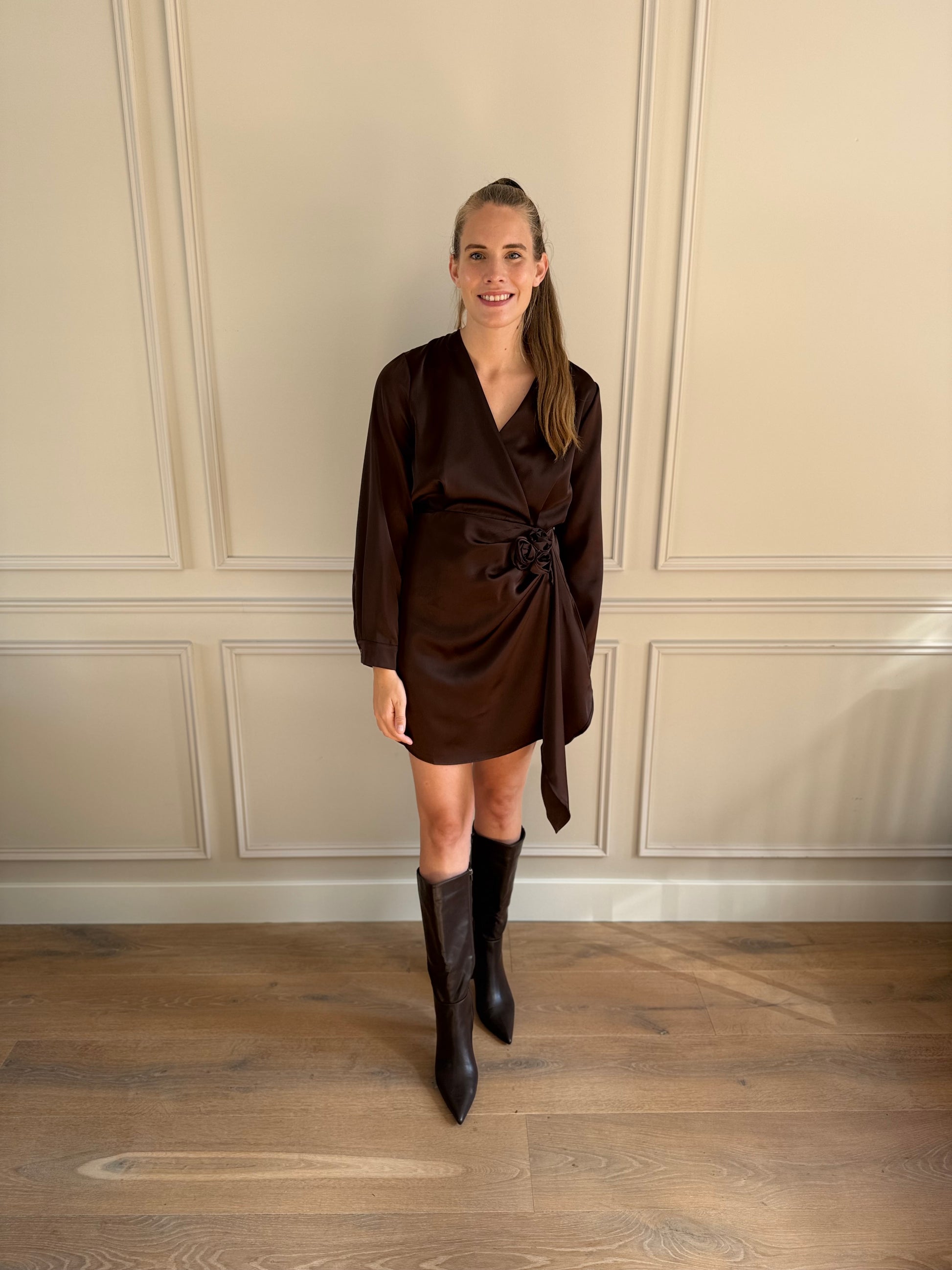 Elegante jurk in chocoladebruin met V-hals en lange mouwen. De plooien en rozenapplicatie in de taille geven een luxe en vrouwelijke uitstraling. Perfect voor een chique diner of feest.