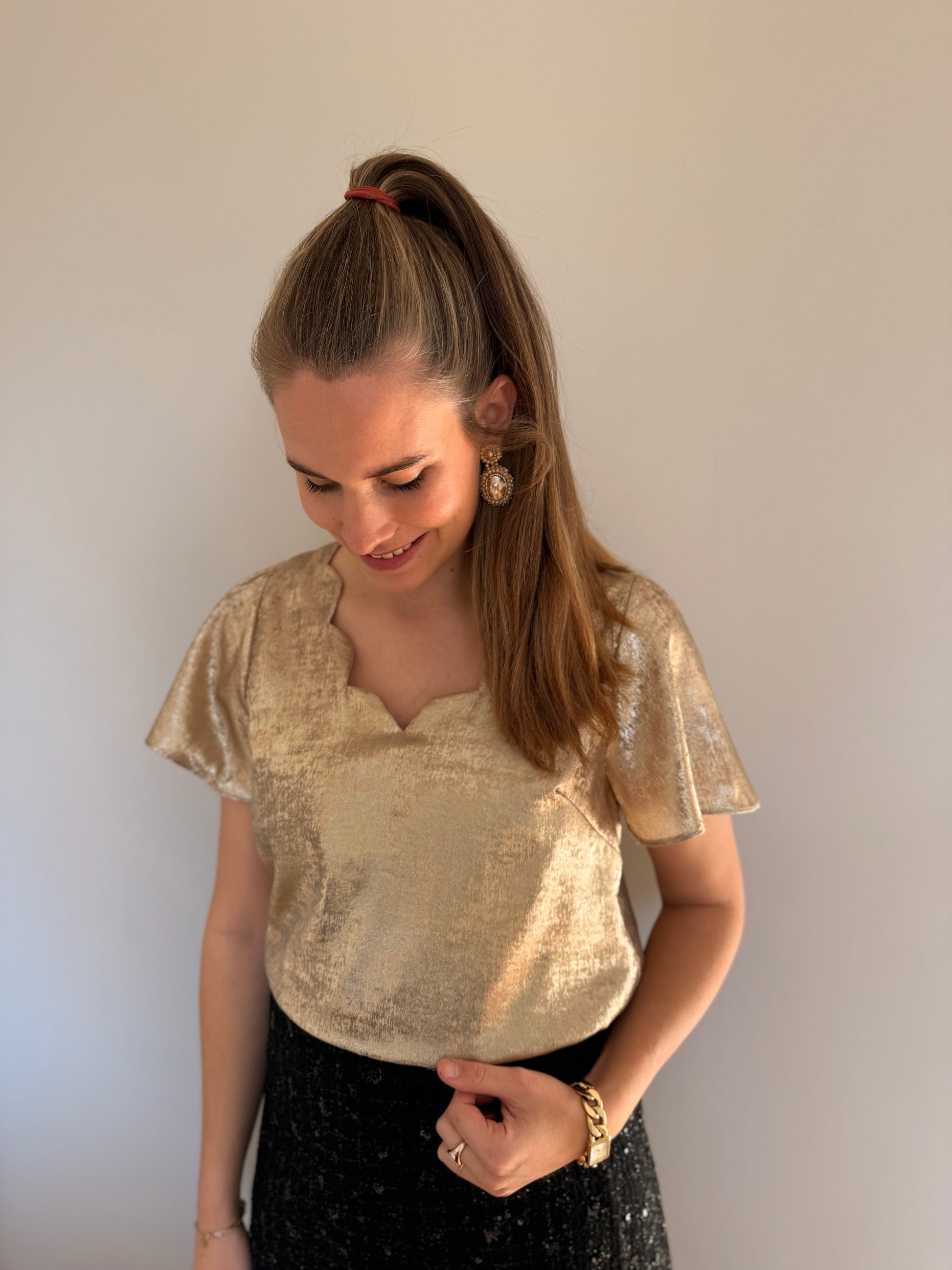Deze prachtige goudkleurige top met uniek geschulpt V-detail straalt pure elegantie uit. De subtiele glans, luchtige pasvorm en vrouwelijke korte mouw maken hem perfect voor feestelijke gelegenheden of een chique avondlook.